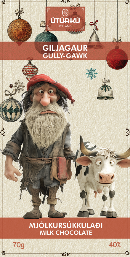 Gully-Gawk (Giljagaur) is the second of the Icelandic Yule lads. He comes down from the mountains on the night of December 13th. Gully-Gawk is known for sneaking into cow sheds at night to steal the froth from the milk pails. In the old days, when people milked cows by hand, a layer of creamy froth formed on top of the warm milk - a rich treat that Gully-Gawk couldn’t resist.