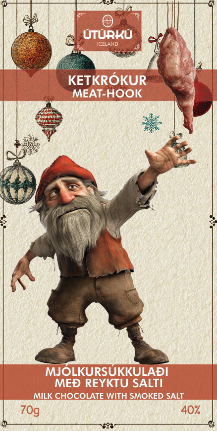 Meat-Hook (Ketkrókur) is the twelfth of the Icelandic Yule lads to arrive. He comes down from the mountains on the night of December 23rd. He is one of the most daring - and hungriest - of them all. Meat-Hook is a resourceful thief. He roams the countryside around Christmas, carrying a long hook or pole with a curved end. When everyone is busy or asleep, he uses it to reach through chimneys, doors, or rafters to hook out pieces of meat - especially smoked lamb, known as “hangikjöt”, a traditional Icelandic Christmas dish.